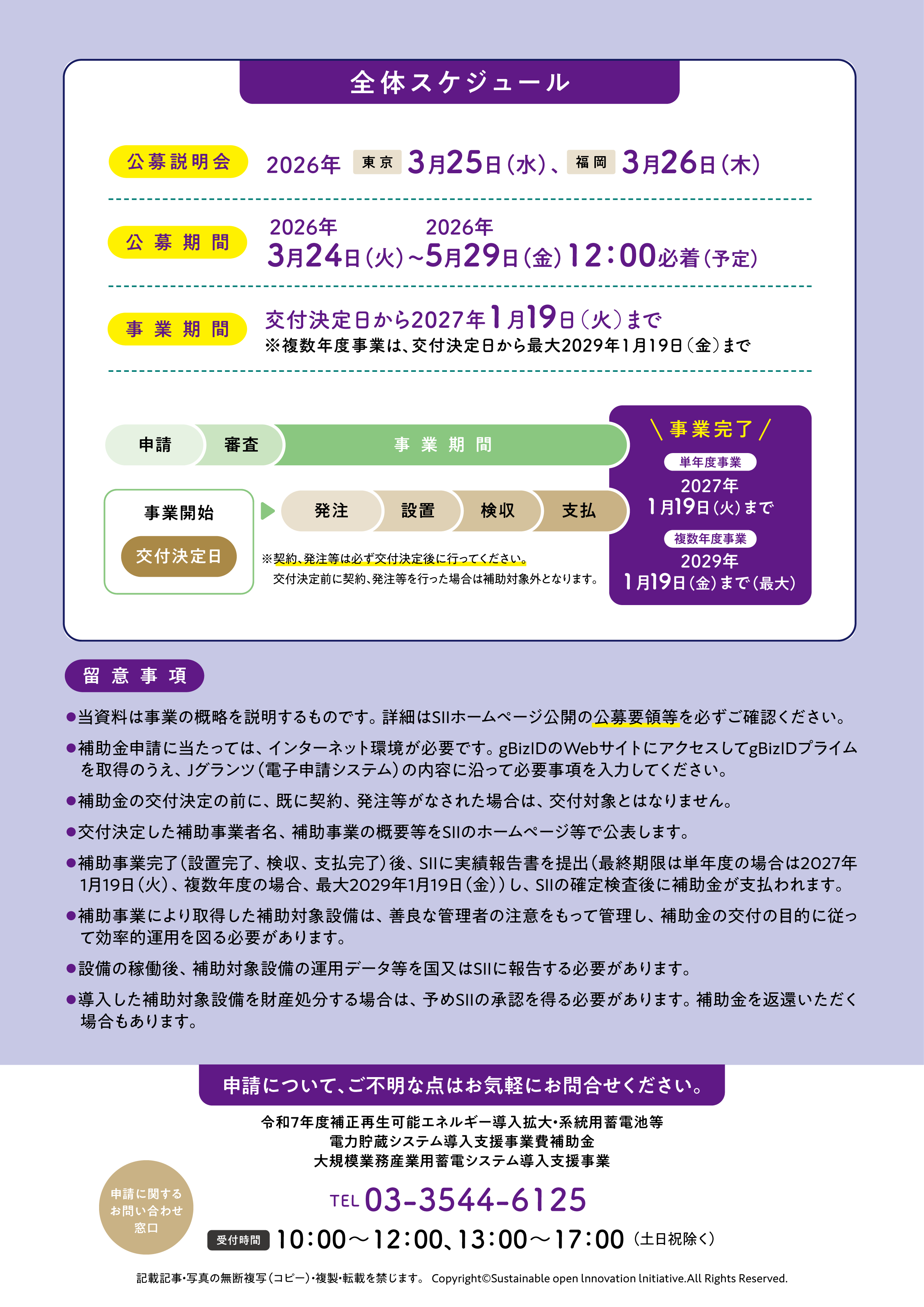 「令和7年度補正 大規模業務産業用蓄電システム導入支援事業」の概要は、以下パンフレット(案)をご確認ください。